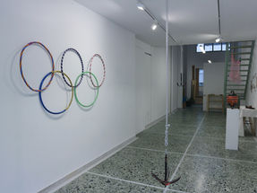 With these, she weaves large colored ropes that she then integrates into the space, creating unpredictable and playful conditions. The artworks she created during her stay at bEam arts are further experimentation on the idea of play as a material, both tangible and symbolic. A long black and white plexi flexi rope that invites the audience to play with it, a large colored knitted piece reminiscent of a mermaid's tail, an installation with children's toys and hula hoops. A colorful and interesting microcosm that invites us to think about how we too can derive the joy of childhood.